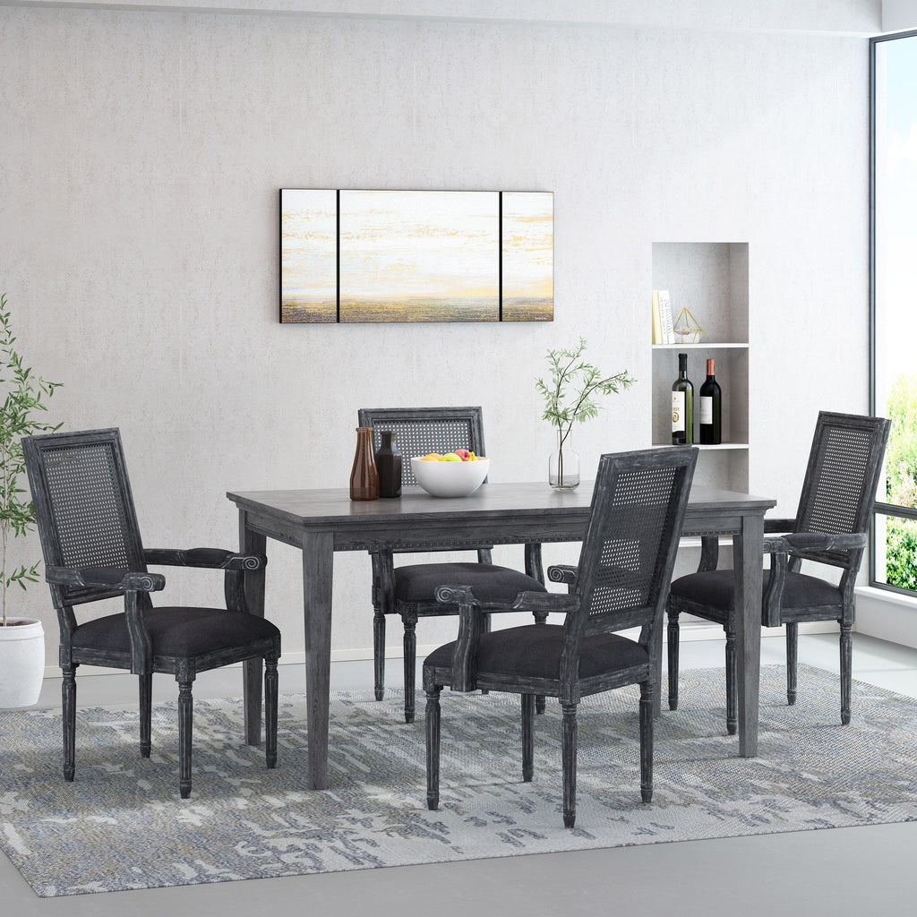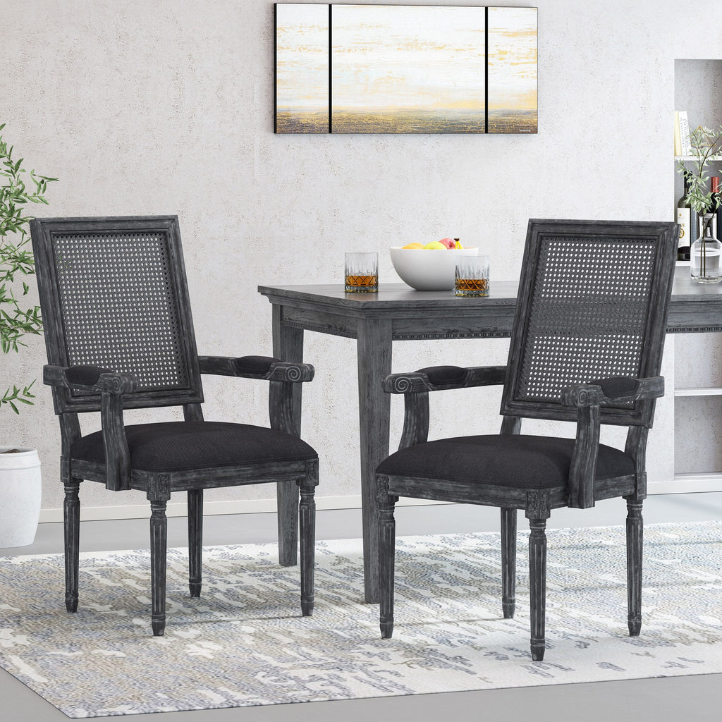 Transform your dining area into one of classic sophistication with seating of utmost style. Drawing from French country inspiration and Queen Anne styling, our set of upholstered dining chairs feature a square backrest made with cane, fluted legs, and exquisite armrests to offer your home something a little out of the ordinary while also remaining true to their elegant, old-fashioned roots. Their weathered frames showcase wonderfully contrasting lines and curves that encourage both casual meals with your family or extravagant dinner parties with your guests.