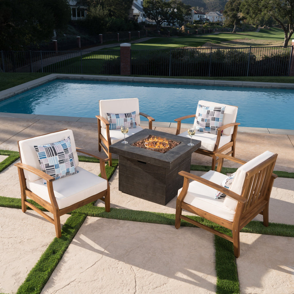 This club chair and fire pit set is the perfect way to add some relaxations space to your backyard. Complete with four club chairs and fire pit so you can warm yourself on those cool summer evenings, this set allows you and your family to relax in the great outdoors in style. Made from sustainably sourced acacia wood paired perfectly with water resistant cushions and a sturdy magnesium oxide fire pit, this set is sure to be a favorite every summer season.
